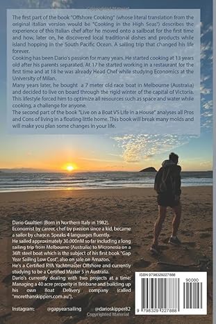 The first part of the book "Offshore Cooking" (whose literal translation from the original italian version would be "Cooking in the High Seas") describes the experience of this Italian chef after he moved onto a sailboat for the first time and how, later on, he discovered local traditional dishes and products while island hopping in the South Pacific Ocean. A sailing trip that changed his life forever.
